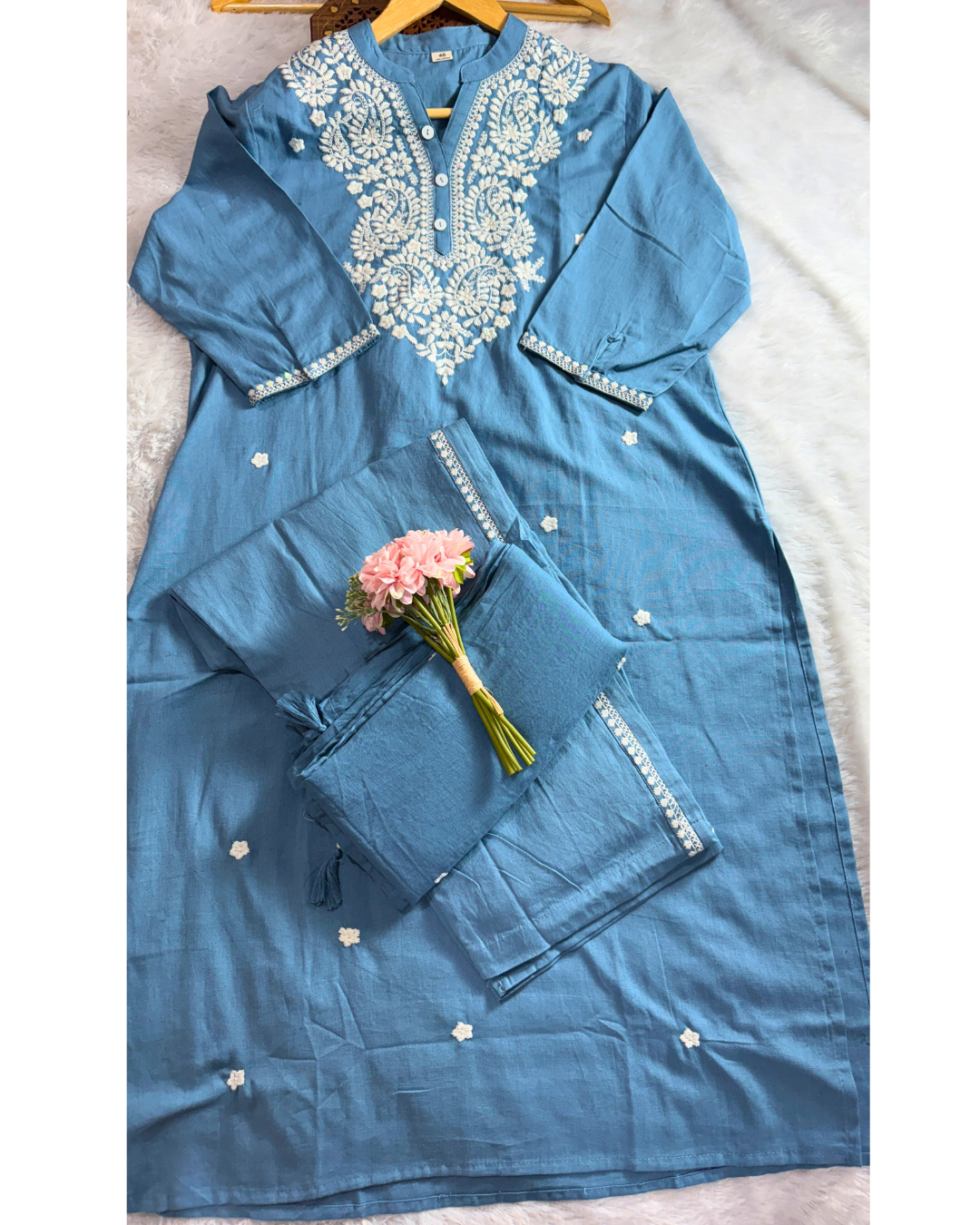 Step into timeless elegance with this Blue Cotton Embroidered Dupatta Pants Set. The kurta features delicate white embroidery on the yoke and sleeves, paired with matching pants and a soft dupatta. The soothing color makes it an ideal pick for office, festive, or family gatherings. Comfortable, chic, and designed for everyday elegance, this set comes in all sizes from S to XXL.