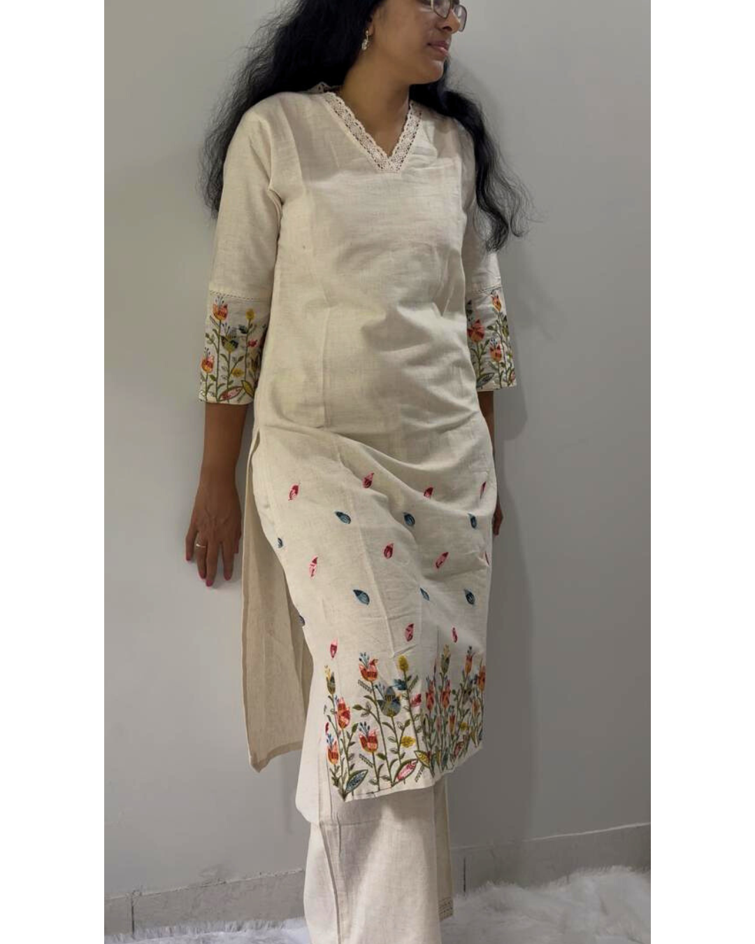 • Kurta: Straight-cut kurta with vibrant floral embroidery along the hem and minimal cross motifs on the body